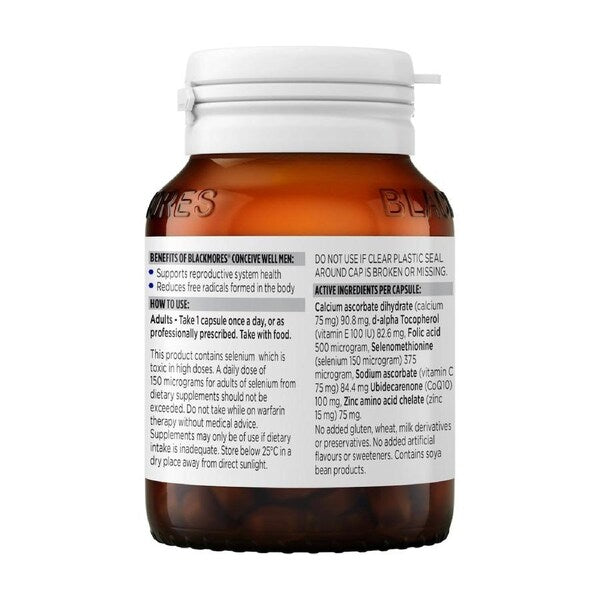 It's important to consider supplementation when you start trying to conceive. Along with a balanced diet, it helps to prepare your body's nutritional needs when trying for a baby. Conceive Well Men contains a comprehensive antioxidant formula to support men's preconception health. It provides important nutrients required for a healthy conception, including: -Selenium: to aid sperm production and sperm motility -Zinc: to support the reproductive system and sperm health -CoQ10: to maintains energy production -Folic Acid: to support healthy energy levels and general wellbeing