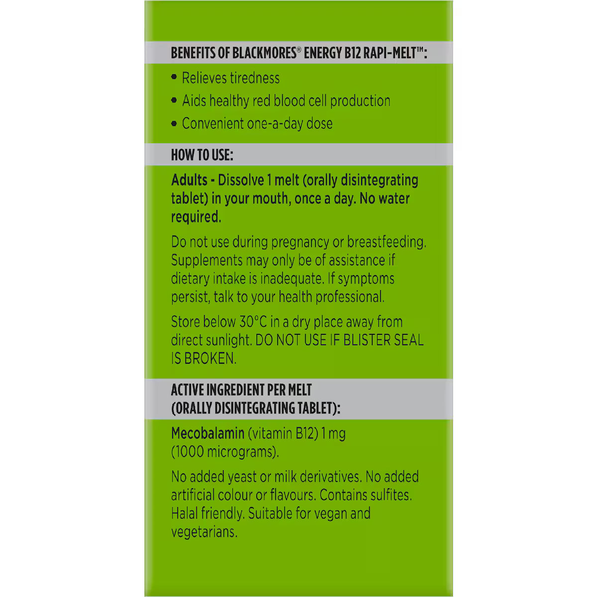 The Blackmores Energy B12 Rapi-Melt™ is a fast dissolving, great tasting and convenient one-a-day dose that allows you to get your daily dose of vitamin B12 on-the-go!