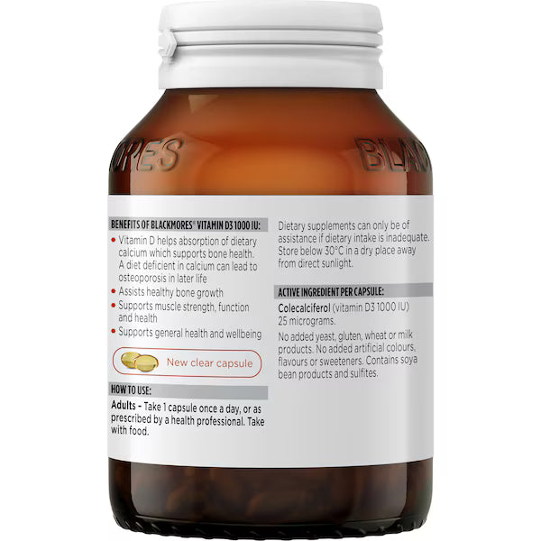 Blackmores Vitamin D3 1000 IU assists healthy bone building. Vitamin D3 supports the absorption of dietary calcium which supports bone health. Vitamin D3 supports immune system health and muscle health.