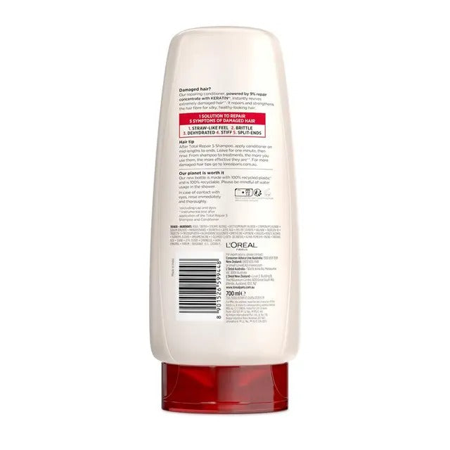 DAMAGED HAIR?? Our repairing conditioner, powered by 9% repair concentrate with Pro-Keratin and Ceramide, instantly revives extremely damaged hair**. It repairs and strengths the hair fibre for silky, healthy-looking hair.? 1 solution to repair 5 symptoms of damaged hair?: Straw-like feel?, brittle?, dehydrated? & stiff?, split-ends?. Hair tip: After Total Repair 5 Shampoo, apply conditioner on mid-lengths to ends. Leave for one minute, then rinse. From shampoo to treatments, the more you use them, the more effective they are**.? The planet is worth it?. Our new bottle is made with 100% recycled plastic* and is 100% recyclable. Please be mindful of water usage in the shower.? *excluding? cap and dyes?. **instrumental test after application of the Total Repair 5 Shampoo and Conditioner.