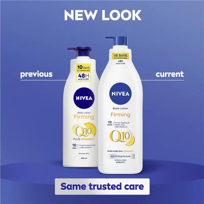 IMPROVED FORMULA. NIVEA Q10 Firming Body Lotion with Vitamin C has been enriched with two powerful antioxidants - Q10 and Vitamin C. The quick absorbing lotion intensively moisturises the skin for 48 hours, for noticeably firmer skin and improving skin elasticity in 10 days.
