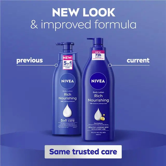 Transform your dry skin with NIVEA Rich Nourishing body lotion, with the new and improved formula that provides clinically proven 72h moisture. For healthy looking skin with every use. Nourishing formula enriched with Pure Hyaluron, Almond Oil and Deep Nourish Serum, this body lotion will deliver intensive care and is perfect for dry to very dry skin. Non greasy and quick absorbing. Some areas of skin dry out quicker than others. That's why it's important to give it extra nourishment all year round. NIVEA cares for your skin and planet. New improved bottle with reduced plastic vs. before / 50% recycled plastic bottle (without pump). <br><br>Ingredient listings for our products might change over time with new innovations. Whilst we try to update this as quickly as we can, it’s best to check the ingredients on your packaging to ensure it’s suitable for your needs.